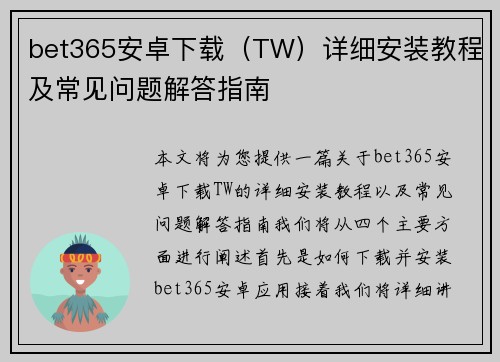 本文将为您提供一篇关于bet365安卓下载(TW)的详细安装教程以及常见问题解答指南。我们将从四个主要方面进行阐述:首先是如何下载并安装bet365安卓应用,接着我们将详细讲解安装过程中的注意事项,随后讨论可能会遇到的一些常见问题及其解决方法,最后,我们会提供一些额外的提示和建议,帮助您更好地使用bet365安卓客户端。通过本文,您将对bet365安卓下载(TW)的安装流程和相关问题有更深入的了解,确保顺利安装并顺利使用该应用。