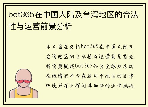 本文旨在分析bet365在中国大陆及台湾地区的合法性与运营前景。首先,将简要概述bet365作为全球知名的在线博彩平台在这两个地区的法律环境,并深入探讨其面临的法律挑战与机遇。接下来,本文将从四个方面进行详细阐述:一是bet365在中国大陆的合法性与政策风险,二是bet365在台湾地区的运营前景与法规框架,三是bet365如何应对技术和市场限制,四是社会文化因素对bet365在两地发展的影响。通过这些分析,旨在为理解bet365在中国大陆与台湾的法律环境和市场动态提供更为清晰的视角。