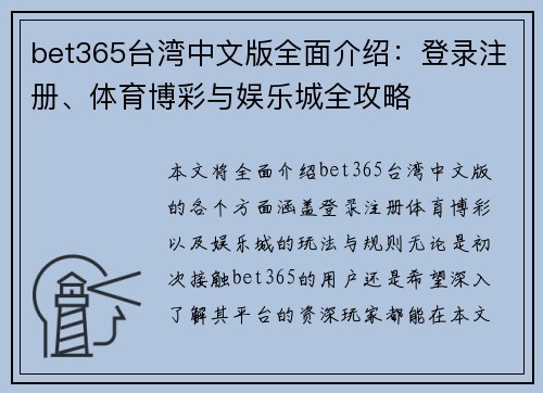 本文将全面介绍bet365台湾中文版的各个方面,涵盖登录注册、体育博彩以及娱乐城的玩法与规则。无论是初次接触bet365的用户,还是希望深入了解其平台的资深玩家,都能在本文中找到所需的详细信息。我们将从四个主要方面展开讨论:首先是bet365台湾中文版的登录与注册流程,其次是体育博彩的玩法与规则,接着是娱乐城的各类娱乐项目,最后是平台的账户管理及其他常见问题的解决方案。通过这篇文章,您将全面掌握bet365台湾中文版的使用方法,享受更加便捷、安全的博彩体验。