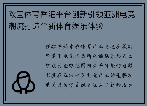 在数字娱乐和体育产业飞速发展的背景下,电竞作为新兴的娱乐形式已然成为全球范围内炙手可热的话题,尤其在亚洲地区,电竞产业的蓬勃发展更是为体育娱乐注入了新的活力。欧宝体育香港平台凭借其创新的业务模式和前瞻性的市场眼光,引领着亚洲电竞潮流,逐渐成为电竞与传统体育娱乐深度融合的佼佼者。本文将从四个方面探讨欧宝体育香港平台如何通过创新推动亚洲电竞潮流的发展,并打造全新的体育娱乐体验。首先,平台的技术创新使得电竞赛事更加高效和互动;其次,欧宝体育香港平台通过深度结合传统体育和电竞,提供跨界融合的娱乐体验;再次,欧宝体育香港平台不断优化用户体验,提升平台的用户粘性;最后,平台的全球视野和战略布局为亚洲电竞产业带来了更多的机遇和挑战。通过这些创新举措,欧宝体育香港平台不仅在亚洲市场占据了重要地位,还为全球电竞行业的发展树立了新的标杆。